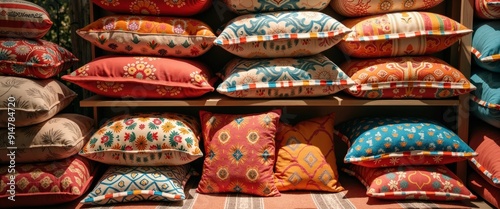 cushion, pillow, colourful, floral, pattern, design, textile, fabric, home decor, interior design, decoration, cosy, comfortable, soft, plush, living room, bedchamber, sofa, armchair, furniture, home, house, style, modern, contemporary, bohemian, vintage, ethnic, tribal, hand-made, craft, cushion, interior, decor, patterned, decorative, floral pattern, shelf, stacked