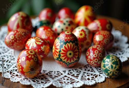 easter, egg, decorated, colourful, lace, doily, spring, holiday, celebration, pattern, vibrant, floral, design, tradition, craft, art, hand-made, festive, red, green, yellow, intricate, arrangement, table, decoration, seasonal, joy, culture, family, gathering, nature, beauty, creativity, symbol, heritage, joyfulness, ornamentation, craftsmanship, unique, cheerful, bright