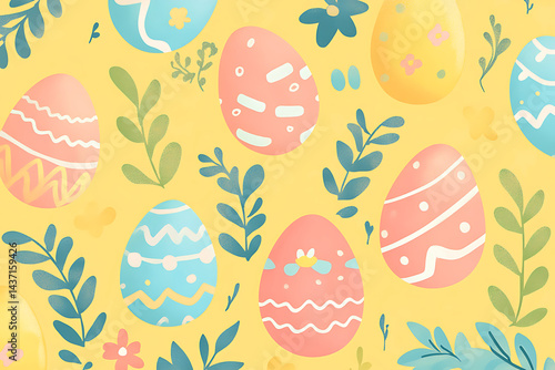 Colorful decorated Easter eggs surrounded by green foliage on a bright yellow background