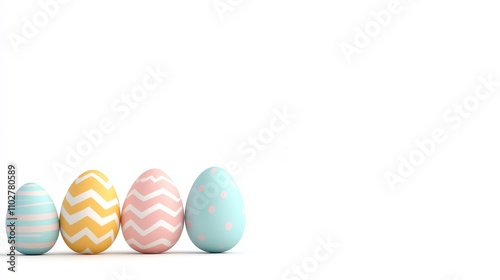 Colorful decorative Easter eggs in pastel shades arranged neatly against a white background, symbolizing spring and festive celebrations.
