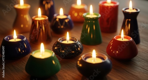 candle, lit, flames, colourful, decorative, wood, table, arrangement, ceramic, light, burning, warm, glow, illumination, wax, tabletop, object, pottery, shape, height, amber, blue, red, green, brown, orange, texture, wooden, rustic, cosy, mood, serene, peaceful, calming, flickering, vibrant, design, simple, art, craft, hand-made, earthenware, glaze, studio, photo, closeup, soft