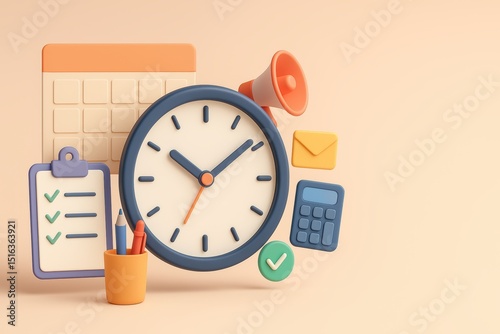 announcement, organisation, planning, stationary, graphic, reminder, office, planner, productivity, checklist, workplace, tool, communication, hours, schedule, minute, desk, time management, sharpened, second, clock, time, concept, design, arrangement, calendar, creative, notification, three-dimensional, colourful, essential