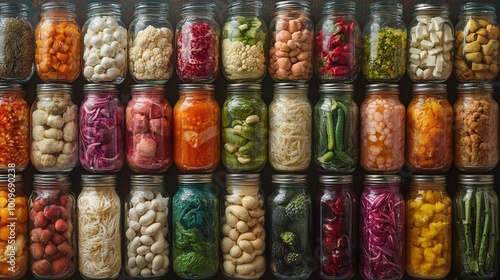colorful display of fermented vegetables and fruits in clear glass jars, showcasing vibrant textures and rich probiotic content, promoting healthy cuisine and natural wellness through fermentation