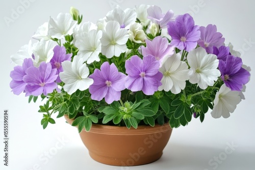 Colorful display of Geranium renardii blooms in a terracotta pot showcasing vibrant spring and summer flowers