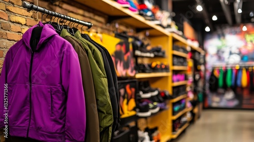 jacket, sneaker, retail, store, fashion, colourful, display, trendy, shopping, clothes, apparel, urban, style, modern, interior, design, clothing, accessory, footwear, casual attire, lifestyle, vibrant, atmosphere, merchandise, showcase, variety, collection, youth, decor, ambience, marketing, consumer, shop, branding, visual, appealing, product, hanging, arrangement, organised, boutique, life events, stylish