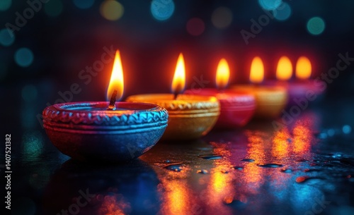 Colorful Diwali Lamps with Glowing Flames and Bokeh Lights in Dark Ambient Setting