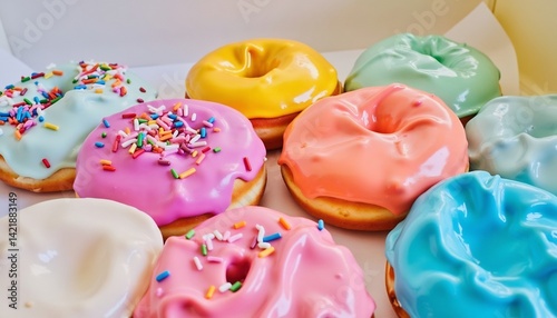 Colorful Donuts: A delightful array of vibrantly frosted donuts, each adorned with playful sprinkles, sit invitingly, embodying a spectrum of flavors and confectionary artistry.
