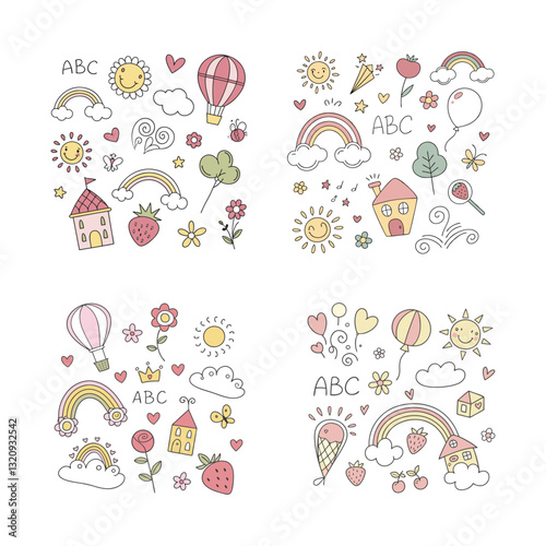 Colorful Doodles & Whimsical Drawings, Childlike Illustrations & Cute Icons, Playful Designs & Pastel Colors, Hand-Drawn Nursery Art & Seamless Pattern Potential