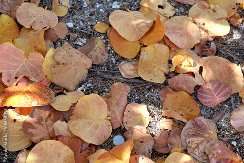 Colorful dry fallen leaves on forest floor or park ground