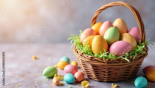 Colorful Easter candy eggs in a basket, spring holiday treats , joy, bunny, celebration