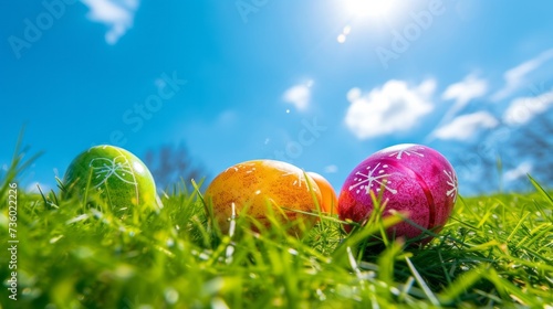 colorful easter egg closeup on green grass on a bright sunny day, concept of celebrating easter and searching for easter eggs with copyspace