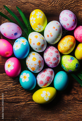 Colorful easter eggs and branch with flowers on wooden desk Generative AI Content by Midjourney