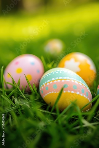Colorful Easter eggs, decorated for spring festivities, hidden in lush green grass, celebrating Easter traditions, family fun, holiday spirit, seasonal joy.