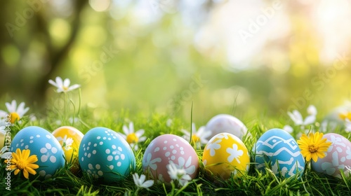Colorful Easter eggs hidden in lush green grass, bright and festive, surrounded by spring flowers, with soft sunlight and ample copy space.