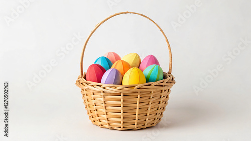 Colorful Easter Eggs in a Wooden Basket on Plain Background for Spring Celebrations