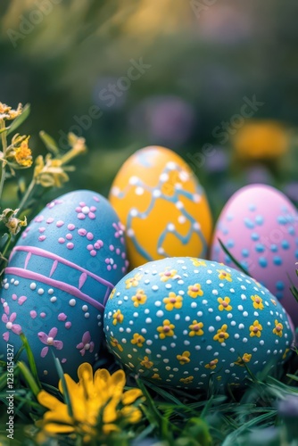 Colorful easter eggs in spring garden setting for holiday decoration and celebration