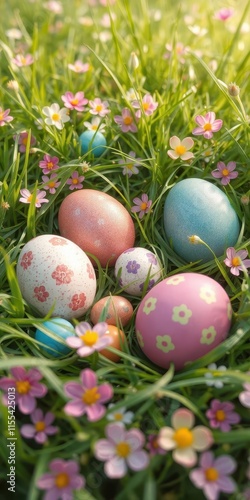 Colorful Easter eggs nestled in spring grass, nature scene,image,outdoor