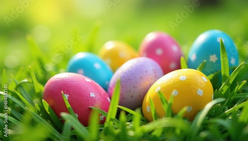 Colorful Easter eggs nestled in spring grass, signifying the Easter season , easter bonnet, shadow