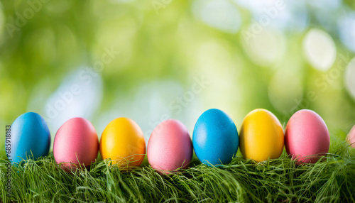 Colorful Easter eggs nestled in vibrant grass against a soft, green-blurred background, symbolizing spring, renewal, and celebration