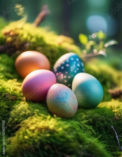 easter, egg, colourful, mossy, forest, sunlight, decoration, vibrant, spring, celebration, nature, outdoors, bright, green, foliage, natural, art, festive, tradition, design, pastel, creativity, texture, unique, holiday, pattern, seasonal, detail, handcraft
