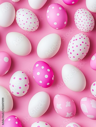 Colorful Easter Eggs on Pink Background - A vibrant arrangement of decorated Easter eggs in pink and white hues resting on a pink background, ideal for seasonal themes.