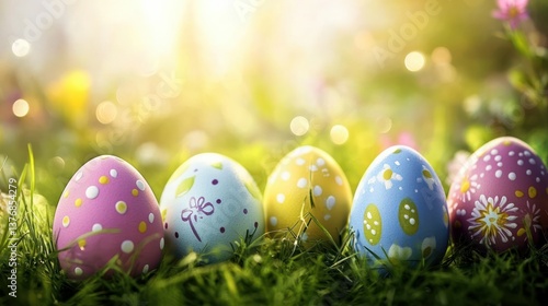 Colorful Easter eggs with various patterns on grass, surrounded by blurred flowers.