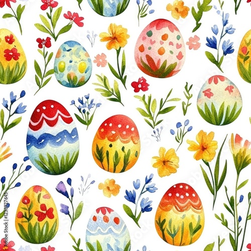 Colorful easter scene with hand drawn different unique different design of easter eggs, spring flowers, seamless pattern