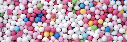 Colorful eatable sugar pearls for food decoration. Panoramic image
