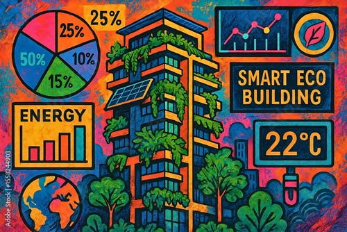 Colorful eco smart building with solar panels and data visualizations on orange and blue abstract city