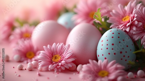 Colorful eggs and fresh chrysanthemums on a soft pink background with space for personalized greetings or advertisements.