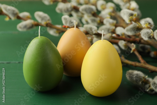 Colorful egg-shaped candles and willow branches on green wooden table, closeup. Easter decor