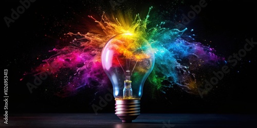 Colorful explosion burst from light bulb in dark setting, creativity, imagination, innovation, bright, vibrant, explosion