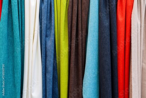 fabric, textile, swatch, sample, material, colours, colourful, assortment, selection, variety, texture, pattern, vibrant, background, furnishing, upholstery, curtain, design, interior, fashion, clothing, shop, store, retail, horizontal, spectrum, drape, hanging, rainbow, merchandise