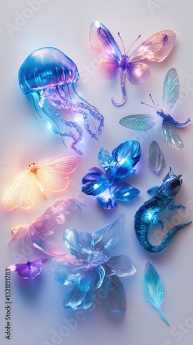 Colorful Fantasy Creatures and Plants in Neon Glow, Artistic Design with Glass Effects and Vibrant Details