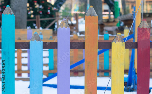 Colorful fence in the shape of pencils outside
