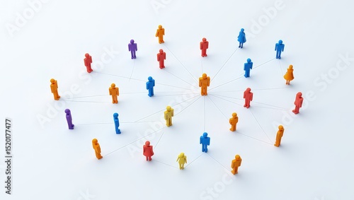 Colorful figures of people interconnected by lines create visual representation of teamwork, networking. Central figure stands out among many individuals leadership, connection. Illustration shows