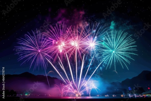 Colorful fireworks exploding in the night sky over a scenic landscape, celebrating a festive event with vibrant sparks and bright colors. Independence Day, July 4. Traditional American Memorial Day