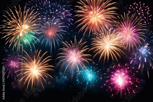 Colorful fireworks lighting up the night sky in celebration, with bright explosions and sparkling stars, perfect for a festive holiday or New Year's event
