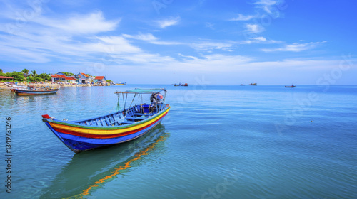 colorful fishing boat floats on calm waters under bright blue sky, surrounded by distant boats and serene coastal landscape