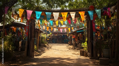 pathway, flag, colourful, village, home, house, building, gate, entrance, archway, wood, wooden, structure, asia, southeast, country, rural, scene, landscape, sunlight, shadow, light, shadow, day, daytime, tree, green, leaf, plant, vegetation, dirt, ground, path, paseo, travel, journey, destination, culture, tradition, religious, spiritual, serenity, peace, calm, atmosphere, ambience, quiet, tranquil