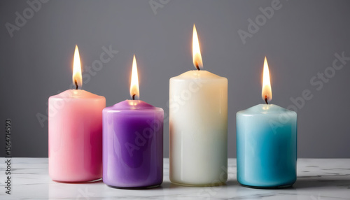 candle, flames, light, glowing, wax, colourful, pink, purple, white, blue, soft light, warm, cosy, serene, tranquil, peaceful, ambience, atmosphere, spiritual, decorative, home decor, celebration, relaxation, meditation, mindfulness, aromatherapy, holiday, advent, memorial, hope, comfort, beauty, simplicity, elegant, closeup, studio shot, still life, grey background, calm, vibrant, soothing, bright, intimate, natural light, symmetric, arrangement