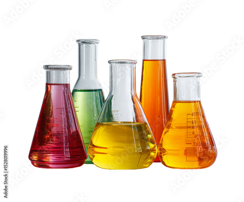 Colorful flasks with liquids for experiments on a transparent background, cut out