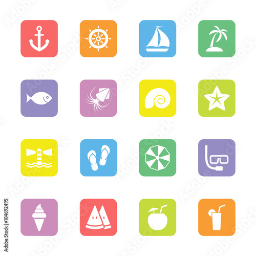 flat, orange, set, summer, vacation, colourful, shell, sea, beach, tropical, season, icon, coconut, palm tree, paradise, rounded, rectangle, starfish, fish, boat, anchor, aqualung, island, umbrella, lighthouse, juice, watermelon, sail, snorkel, helm, diver, squid, ice cream, slipper