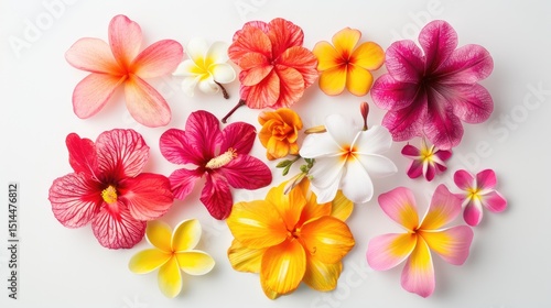 flower, tropical, hibiscus, plumeria, frangipani, blossom, bloom, flower petals, white, background, orange, yellow, pink, red, magenta, vibrant, colourful, arrangement, exotic, flora, botany, nature, beauty, summer, spring, bright, delicate, soft, pastel, colours, closeup, macro, detail, design, artwork, illustration, aesthetic, pretty, floral, art, graphic, image, photo