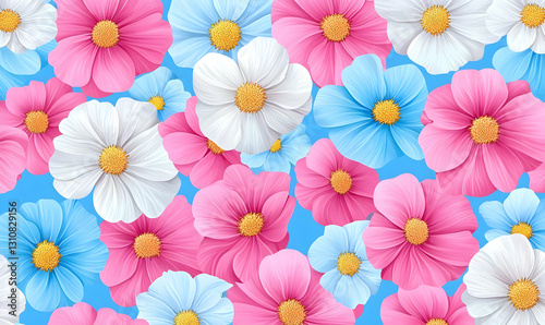 Colorful Floral Pattern Featuring Pink, Blue, and White Flowers