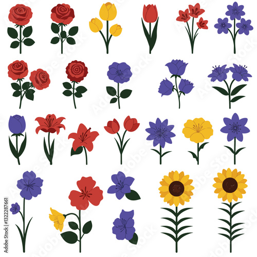 flower, arrangement, colours, vibrant, design, flat, illustration, digital, art, rose, tulip, lily, sunflower, daisy, leaf, green, yellow, red, purple, blue, floral, nature, graphic, pattern, decorative, botanical, spring, summer, bloom, beauty, creative, texture, outline, shape, style, artistic, visual, composition, colourful, bright, seasonal, fresh, unique, aesthetic, category