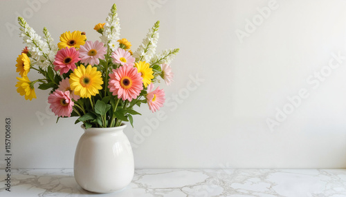 Colorful flower bouquet in white vase on marble table, vibrant floral arrangement, copy space, International Women's Day March 8