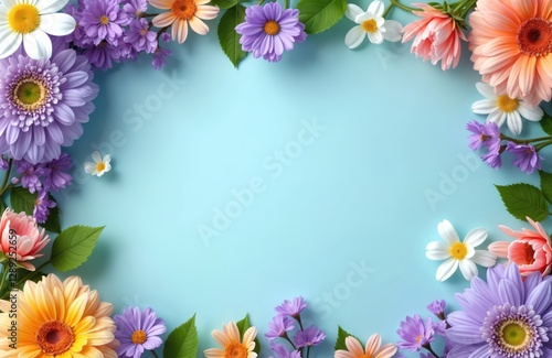 Colorful flower frame on pastel blue backdrop. Greeting card design for Mothers day Easter Valentine day holiday. Spring composition with copy space for text for banner, web.