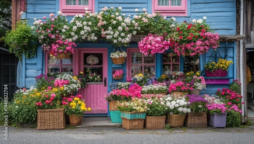 Colorful flower shop facade adorned with vibrant blooms in baskets and hanging planters