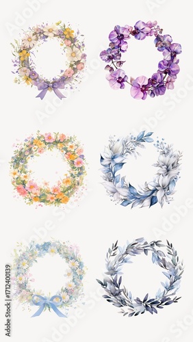 chaplet, flower, decorative, design, illustration, watercolor, botanical, nature, spring, art, element, floral, purple, ribbon, summer, pink, set, graphic, pastel, yellow, daisy, white, blossom, elegant, seasonal, collection, hand-painted